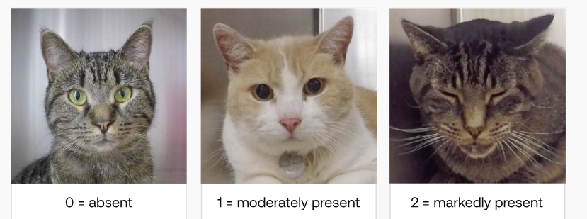 Le chat est loin d’être inexpressif, il possède plus de 200 expressions faciales. L’expression faciale de votre chat est donc l'un des moyens les plus fiables de reconnaître la douleur. Des vétérinaires canadiens se sont basés sur des données scientifiques pour mettre en place une échelle de la grimace de douleur chez le chat (FGS : Feline Grimace Scale). Facile à utiliser même pour les particuliers, cette échelle donne une idée claire de l’état de douleur du chat sur un moment précis.